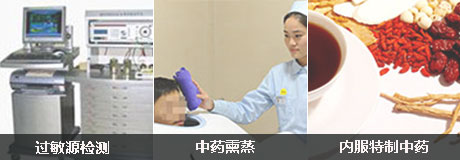 肤康特色疗法“中医抗敏免疫综合疗法”根据“病在表皮,根在血液”的中医理论,采用过敏源检测治疗仪系统科学化检查诊断,针对各种过敏,从源头入手,清除过敏源,结合中药薰蒸促进皮肤生理循环,清除毒素等特性治疗皮肤过敏。